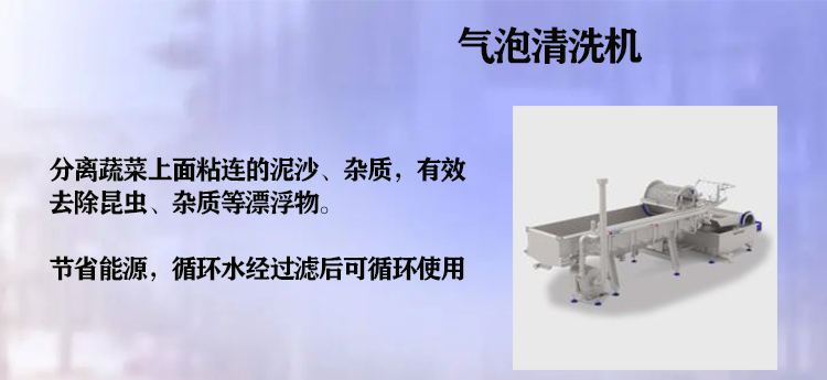 本設備流水線包括:清洗、烘干、冷卻、炒制、包裝等整條線設備,適合給蔬果清洗加工。氣泡清洗裝置去除產品表面污漬、殘留雜質,并可進行消毒固色。設有溢流槽,漂浮物可從此設備流出,且溢流槽有過濾功能,沉淀物從排污口排出,以達到清洗的目的。沖洗干凈的蔬菜被帶往風干機,以此進行表面水分干燥。本清洗機在出料端設有除雜篩網,可收集漂浮物,便于清理。